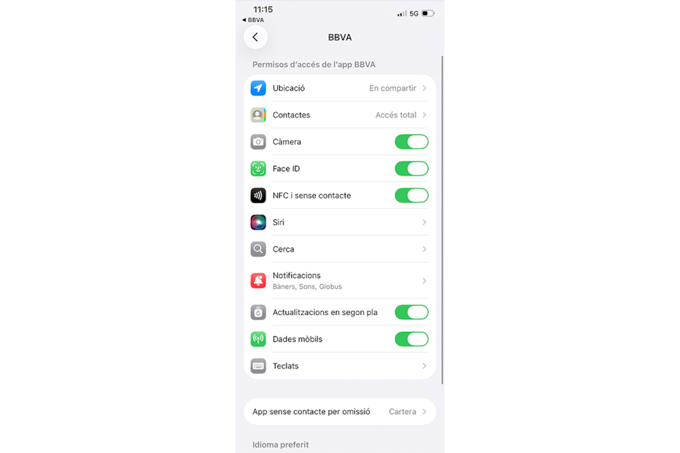 Accedeix a “App sense contacte per defecte”. A més des d'aquí en qualsevol moment podràs configurar BBVA Pay com a mètode de pagament per defecte al teu iPhone seguint aquests passos: