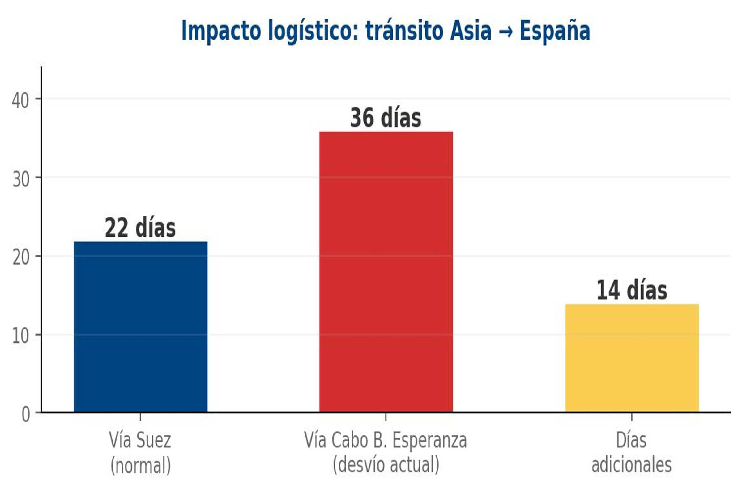 Tráfico Suez -45 %. Desvío +14 días. Sobrecoste puertos ES: 142 M€.