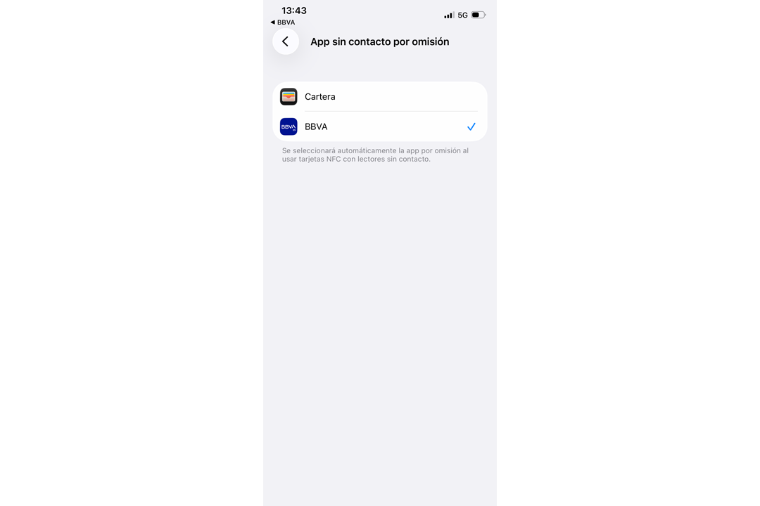 Access the "Default contactless app". Additionally, you can set BBVA Pay as your default payment method on your iPhone at any time from here by following these steps: